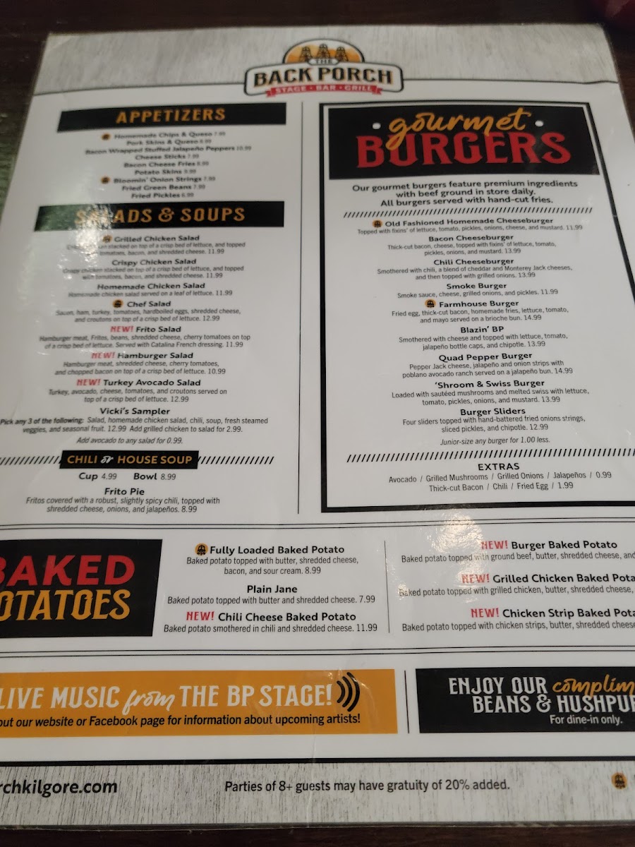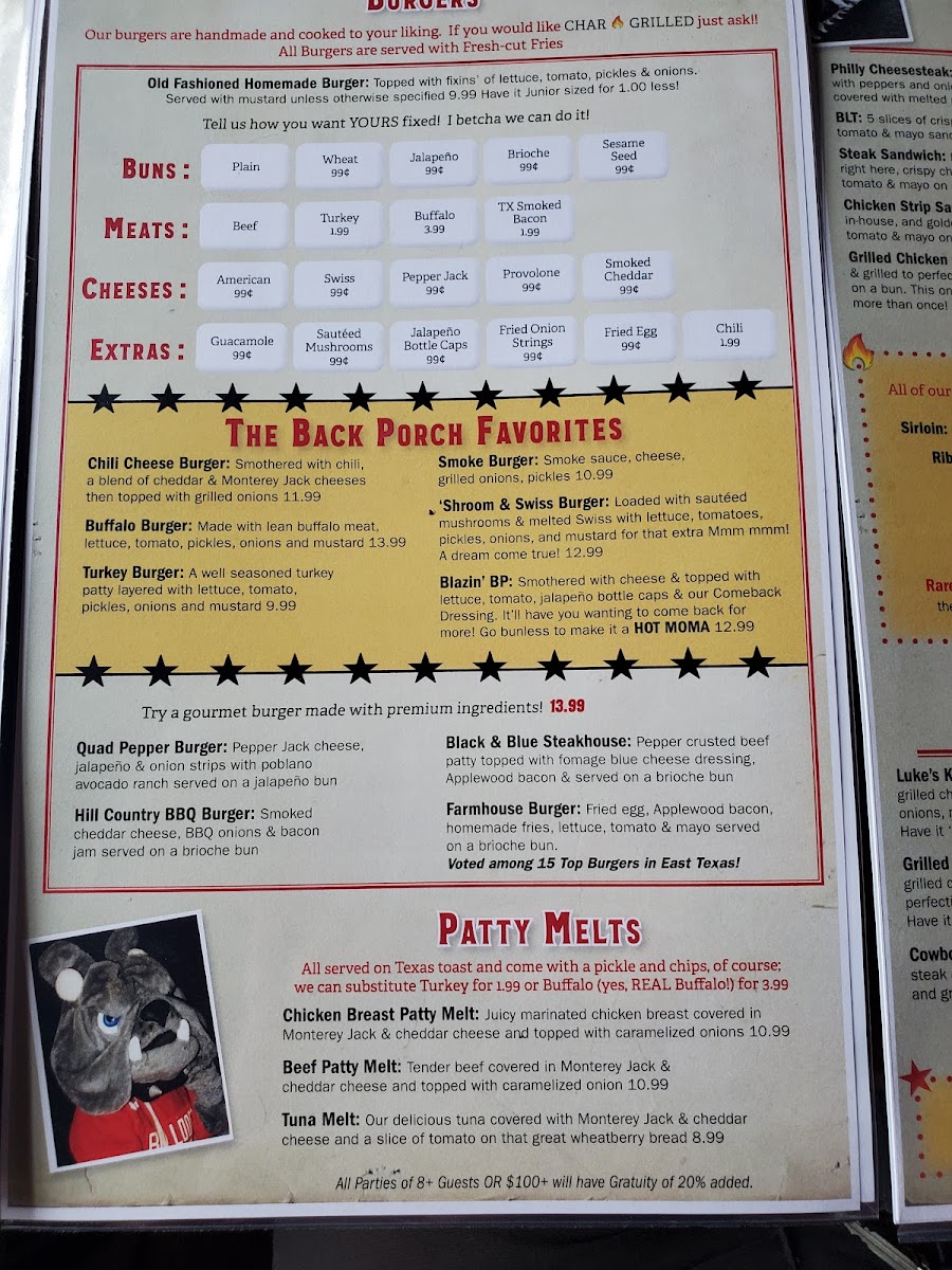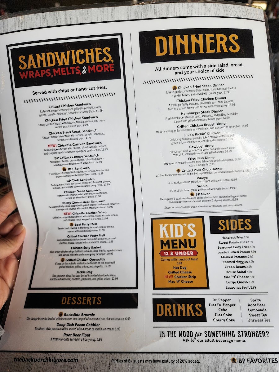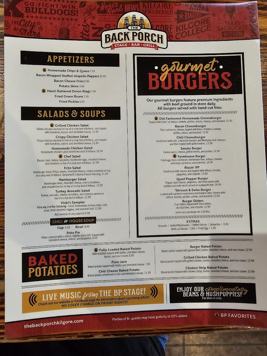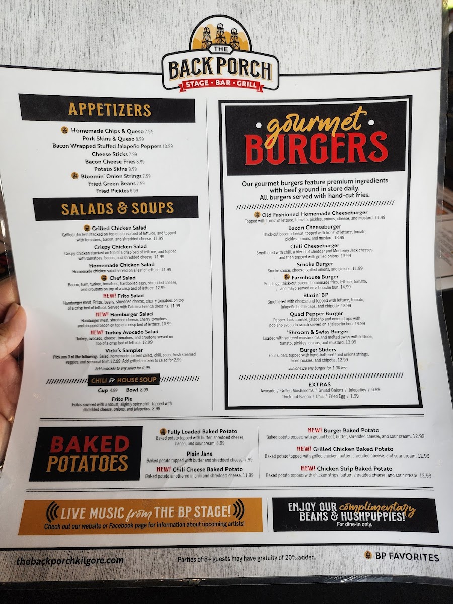 If you're craving a delicious, homey meal in a cozy setting, the The Back Porch Kilgore Menu is your perfect choice. Located on Broadway Blvd in Kilgore, TX, this gem offers a delightful selection of dishes that will satisfy your taste buds. Whether you're in the mood for something light or ready to indulge, their menu has something for everyone. From freshly prepared salads to hearty comfort foods, each dish is crafted with care and packed with flavor. Don’t forget to check out their daily specials for unique options that change with the seasons. Enjoy your meal in a relaxed atmosphere where great food and friendly service come together to create a memorable dining experience. Whether it’s a casual lunch or a dinner with friends, the The Back Porch Kilgore Menu has all you need to enjoy a satisfying meal.